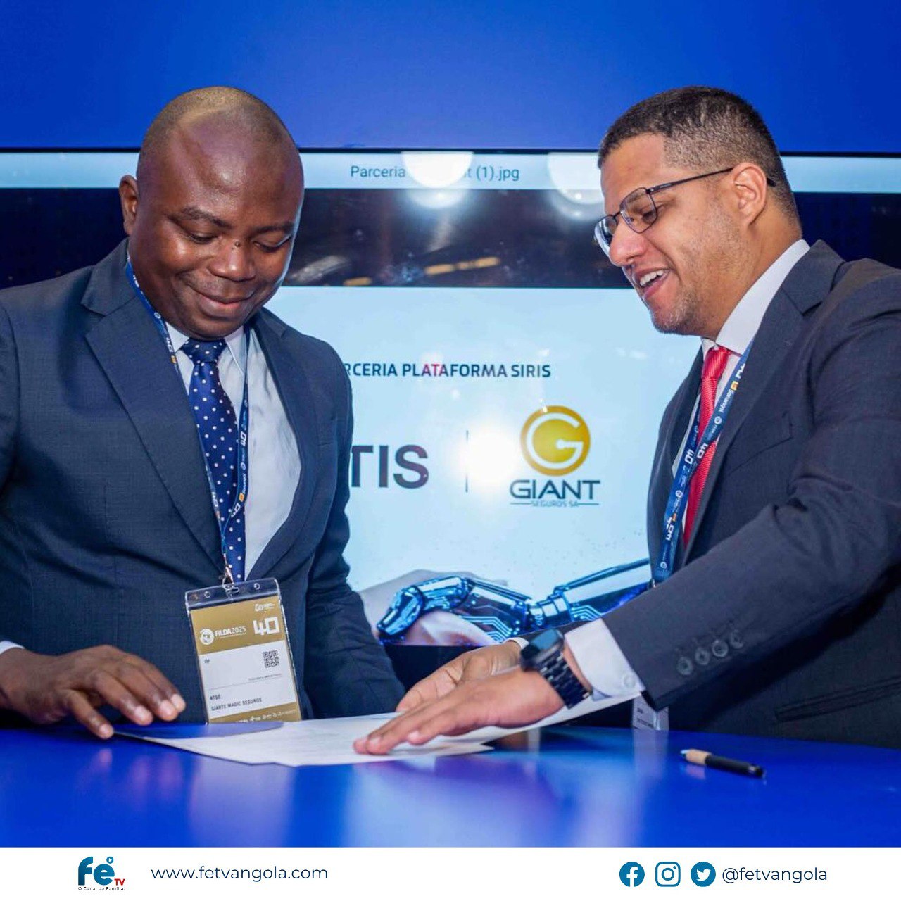 A assinatura do acordo foi realizada no palco principal da feira, com a presença do Dr. Helder Jorge, Presidente do Conselho Executivo da GIANT Seguros, e do Dr. Willian Oliveira, Diretor Geral da TIS Angola.