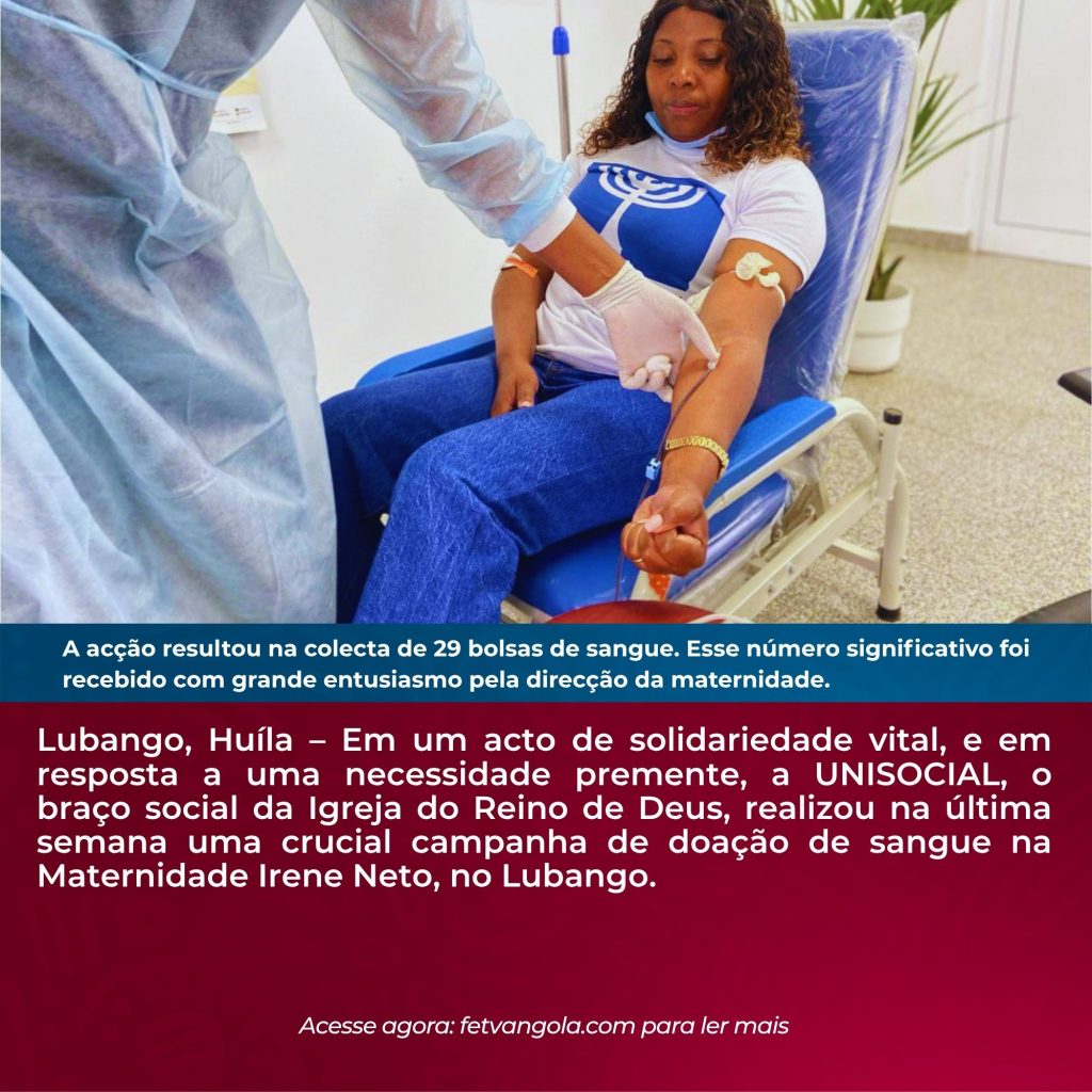 Lubango, Huíla – Em um acto de solidariedade vital, e em resposta a uma necessidade premente, a UNISOCIAL, o braço social da Igreja do Reino de Deus, realizou na última semana uma crucial campanha de doação de sangue na Maternidade Irene Neto, no Lubango. A iniciativa surgiu como uma resposta directa e urgente à escassez de sangue que a unidade hospitalar enfrenta. A igreja prontamente atendeu ao apelo e, reafirmou o seu compromisso com a comunidade.